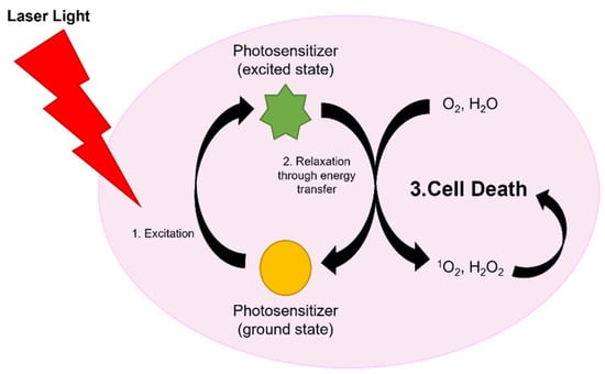 Mechanism of PDT for cellular death. A photosensitizer is delivered to tumor tissue and irradiated with laser light that matches its excitation wavelength. Upon relaxation, energetic crossing transfers the energy to oxygen and water, generating cytotoxic singlet oxygen (1O2) and hydrogen peroxide (H2O2). Cell death is only observed where the laser light is administered, limiting damage to nearby healthy tissue.