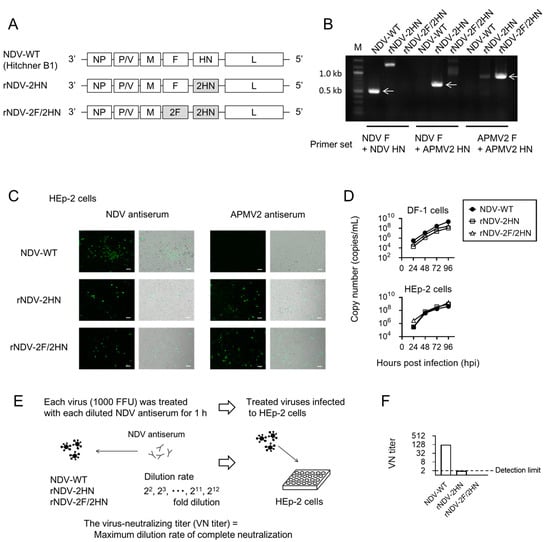 Viral propagation was conducted using embryonated eggs, and the allantoic fluid was harvested and purified by ultracentrifugation with 20% sucrose cushion for 2.5 h at 26,000 rpm at 4 °C. Total RNA was extracted from each purified viral solution using ISOGEN II (Nippon Gene, Tokyo, Japan), and reverse transcription was performed by ReverTra Ace qPCR RT Master Mix (TOYOBO, Osaka, Japan). Unique amplification patterns were confirmed by PCR (Figure 1B and Figure 2B,C) using the primers, as shown in Table S1. Titers were determined by fluorescent focus unit (FFU) using the immunostaining assay, according to previously described methods []. Pathogenicity was evaluated by mean death time (MDT) in embryonated chicken eggs, according to previously described methods []. Viral genome stability was confirmed by sequencing the F and HN genes using virus passaged in embryonated eggs and virus passaged in HEp-2 cells. Experiments using viruses were conducted at the Kyoto Prefectural University of Medicine under Biosafety Level 2 conditions. All experiments using recombinant DNA were conducted in accordance with the relevant Japanese laws. Risk assessments were conducted by the Living Modified Organisms Committee of Kyoto Prefectural University of Medicine and by the Ministry of Education, Culture, Sports, Science, and Technology of Japan. After these assessments, the experiments and modified methods were approved by the Biological Safety Committee of Kyoto Prefectural University of Medicine (Approval number 2022-113, approved 26 October 2018 and 24 June 2022).