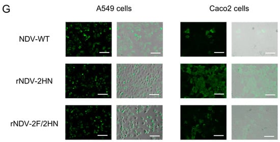 In Figure 1, chimeric NDVs construction and the properties were confirmed. We constructed two types of infectious chimeric NDVs, namely rNDV-2HN, which replaced the wild-type NDV (NDV-WT) HN gene with the APMV-2 HN gene, and rNDV-2F/2HN, which replaced the NDV-WT F and HN genes with the APMV-2 F and HN genes, respectively (Figure 1A). To confirm the recombination of these genes, PCR was performed using primers designed at each gene and cDNA that was reverse-transcribed from the RNA of each recombinant virus (Figure 1B). Only in the case of specific cDNAs and primers were strong bands observed at the target size, as indicated by arrows. Although some non-specific bands that indicated lower intensity were observed, they were also observed in the PCR using the constructed plasmids as a template (Figure S1). To investigate the stability of the chimeric NDV genome, the F and HN genes of the virus passaged in embryonated eggs and HEp-2 cells were sequenced (Figure S2). Viruses propagated in embryonated eggs indicated only one base mutation in the F of both chimeric NDVs and no mutations in the HN genes. Amino acid mutation was detected in the F of rNDV-2F/2HN (aa: I104L in ectodomain). Viruses propagated in HEp-2 cells at least three times only showed a few mutations (Figure S2B). Therefore, each constructed virus particle has recombinant genes and presents high stability. Subsequently, infectivity and antigen expression were confirmed by immunostaining using NDV and APMV-2 antisera. HEp-2 cells, which were respiratory epithelial cell lines infected with NDV-WT, were stained by NDV antiserum, whereas the cells infected with rNDV-2HN and rNDV-2F/2HN were stained by both NDV and APMV-2 antisera (Figure 1C). Infectious viruses expressing the targeted antigen were identified. rNDV-2HN was able to infect the cells using different viral surface proteins. The cells infected with rNDV-2HN and rNDV-2F/2HN expressed both NDV and APMV-2 antigens. Viral replication rate in the chicken (DF-1 cells) and human cell lines (HEp-2 cells) was also evaluated. Viral replication was shown in both cell lines, and its replication rate was similar among these recombinant NDVs (Figure 1D). To confirm the escape from NDV antiserum, each virus was treated with diluted NDV antiserum, following which HEp-2 cells were infected with the virus (Figure 1E). The two types of chimeric viruses showed lower values of virus-neutralizing titer (VN titer) and escape from NDV antiserum (Figure 1F). HN is a major antigen that has the possibility of inducing NDV-neutralizing antibodies during infection [,]. Replacement of HN resulted in a significant escape from antisera. Some human cancer cell lines were infected to explore the potential of these chimeric viruses as cancer treatment tools. These two types of chimeric virus indicated infection to both respiratory (A549) and colon cancer (Caco2) cell lines, and showed potential as a cancer treatment tool similar to NDV-WT (Figure 1G).