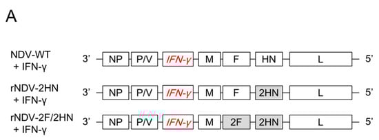 The IFN-γ gene was amplified by PCR according to sequence (Accession no. NM_000619) and inserted between the P/V and M genes using an In-Fusion HD Cloning kit. All construct structures are indicated in Figure 2A. Infectious viral particles were obtained through rescue experiments, as previously described [].