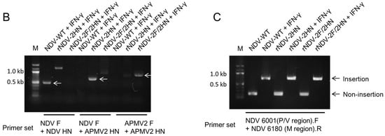 IFN-γ was inserted into all recombinant NDVs. (A) Structure of each viral genome. IFN-γ was inserted between the P/V and M genes. (B,C) Electrophoresis of PCR products, which contain amplified cDNA derived from viral genomes using each primer set. Arrows indicate expected size.