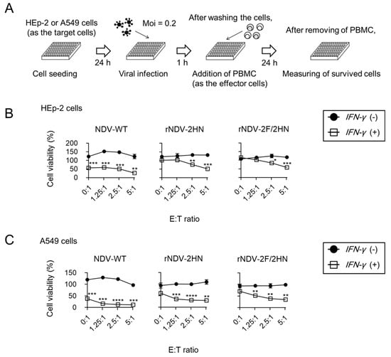 Recombinant NDVs + IFN-γ induced modification of anti-tumor responses by PBMC. (A) Schema of killing assay using PBMC. (B,C) Cell viability of HEp-2 and A549 cells 24 h after infection at each E:T ratio. Cell viability was compared to that observed when infected with viruses without IFN-γ insertion (n = 3, * p < 0.05, ** p < 0.01, *** p < 0.001, **** p < 0.0001).