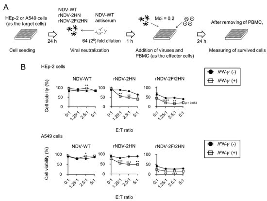 In the presence of NDV antiserum, rNDV-2HN/rNDV-2F2HN + IFN-γ induced modification of anti-tumor responses by PBMC. (A) Schema of killing assay using PBMC in the presence of NDV antiserum. (B) Cell viability of HEp-2 and A549 cells 24 h after infection at each E:T ratio. Cell viability was compared to that observed when infected with viruses without IFN-γ insertion (n = 3, * p < 0.05, ** p < 0.01, *** p < 0.001, **** p < 0.0001).