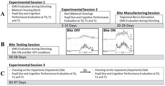 Flow chart of the experimental procedures. (A–C) represent successive periods of time. The 5 main boxes represent the performed sessions. The time passed from the initial session (experimental session 1) is indicated in the grey bars. The inner boxes report (from above) the execution of trigeminal nerve stimulation/EMG recordings, the specific chewing condition evaluated in the session, and the recorded variables measured at T0, T1, and T2. The insets in (B) represent the EMG activity recorded in a representative subject during the bite testing session, while clenching with (Bite ON) or without (Bite OFF) the bite splint interposed between the dental arches. Calibration bars along the X- and Y-axes report measures in seconds and µV, respectively. LMM: left masseter muscle. RMM: right masseter muscle.