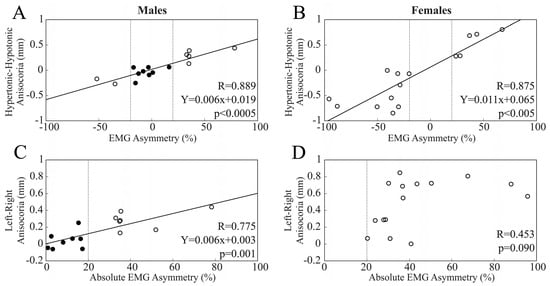 Correlation between anisocoria and EMG asymmetry. Anisocoria and EMG asymmetry evaluated as left–right side difference (A,B) as well as hypertonic–hypotonic side difference (C,D). Males and females are plotted in (A,C) and (B,D), respectively. Anisocoria baseline values are the averages evaluated across conditions (n = 4) at T0. For (A–C), continuous lines correspond to the regression lines evaluated across all of the plotted points. Vertical dotted lines separate BAL (dots) from IMB (circles) subjects.
