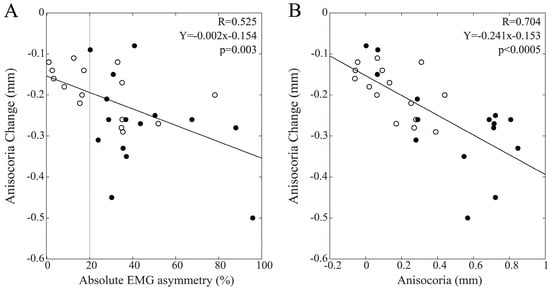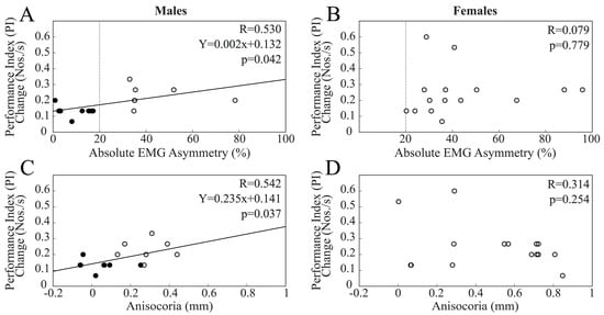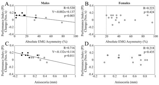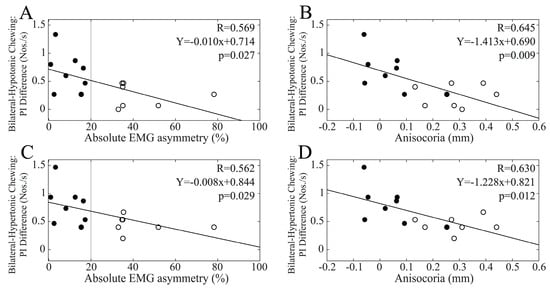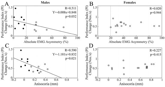 When chewing on the hypertonic side was considered, changes in PI at T1 were significantly and negatively correlated with EMG asymmetry (R = 0.520, Y = −0.002X + 0.137, p = 0.003). The same results could also be observed for pupil asymmetry (R = 0.459, Y = −0.132X + 0.116, p = 0.011). As shown in Figure 5, these correlations reached significance only within the male population (Figure 5A,C), with the difference between R values being significant for both EMG asymmetry (z = −1.999, p = 0.023) and anisocoria (z = −1.681, p = 0.046).