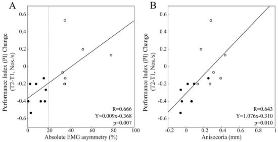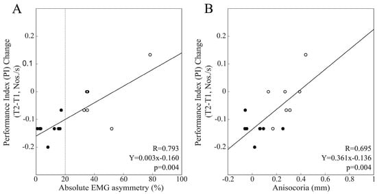 No correlation was found between PI changes at T2 and EMG asymmetry, whatever population was considered. The lack of significant correlations among males could be attributed to the larger drop in PI at T2 with respect to T1 in the population of BAL subjects (−0.133 ± 0.036 Nos./s) with respect to IMB males (−0.02 ± 0.08 Nos./s, p = 0.004), leading to the significant correlation between the T2–T1 PI difference with EMG asymmetry and anisocoria (Figure 6).