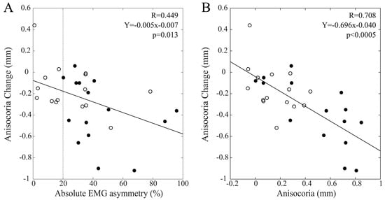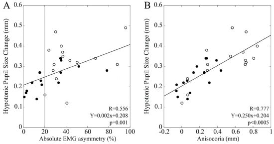 The changes observed in pupil size, anisocoria, and PI at T1 and T2 with respect to T0 were separately correlated with EMG asymmetry and anisocoria by linear regression analysis. Statistics were obtained for the whole population, as well as separately for males and females.