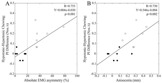 Finally, when chewing occurred on the hypotonic side, changes in PI at T1 were not significantly correlated with baseline EMG asymmetry (R = 0.299, p = 0.108) and anisocoria (R = 0.073, p = 0.701) values within the whole population. As shown in Figure 7, these correlations were present in males, but not in females. As observed for the other chewing patterns, PI changes at T1 were also correlated with anisocoria within the male population.