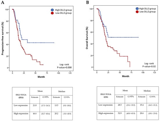 Overall, 134 patients were classified as having a low DLL3 expression of mRNA and 45 were classified with a high DLL3 expression of mRNA. From the 139 patients evaluated for PFS, those with a lower expression of DLL3 showed a mean PFS of 21.8 months (95%CI: 17.3–26.3 months) and median PFS of 13.5 months (95%CI: 9.0 to 18.0 months) compared with the mean PFS of patients with high DLL3 expression (46.6 months; 95%CI: 32.7–60.4 months) and the median PFS for DLL3 high expression, which was 20.2 months (95%CI: 0–40.9 months). Interestingly, the median PFS differences from high to low DLL3 expression samples was 6.7 months (Figure 1A, p-value = 0.008).