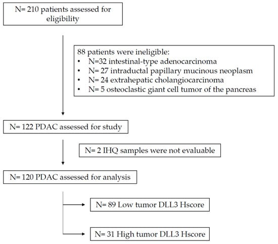 From 2007 to 2013, a total of 210 patients underwent duodenopancreatectomy. From the pathologic report, 32 were intestinal-type adenocarcinoma, 27 were intraductal papillary mucinous neoplasm (16 with associated invasive carcinoma), 24 were extrahepatic cholangiocarcinoma, and 5 were classified as osteoclastic giant cell tumor of the pancreas. Overall, 122 of the initial 210 patients were diagnosed as PDAC and were therefore admitted to analysis. Unfortunately, two samples were not evaluable clinicopathologically; thus, the sample size was composed of 120 patient samples (Figure 2).
