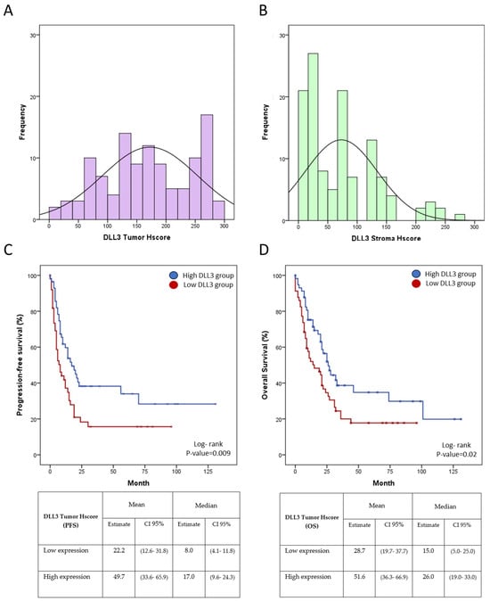 Interestingly, the DLL3 immunohistochemical expression of the stroma was higher than expected in normal pancreatic tissues. The expression shows a percentage of expression that ranges from 5 to 90%, with a mean and median value of 35.7% and 35%, respectively. DLL3 intensity was low in 41 (33.8%), medium in 56 (46.2%), and high in 24 (20%) samples from a total of 120 samples. The Kolmogorov–Smirnov test does not support a normal distribution of DLL3 expression in the stroma samples (p-value < 0.001) (Figure 3B). Low DLL3 tumor expression showed a shorter median PFS of 8 months (95%CI: 4.1–11.8 months) compared with the median PFS of the high DLL3 expression arm, which was 17 months (95%CI: 9.6–24.3 months) (p-value = 0.009). Also, the mean PFS of the low DLL3 expression group was 22.2 months (95%CI: 12.6–31.8 months), while the mean PFS of the high DLL3 expression group was 49.7 months (95%CI: 33.6–65.9 months) (Figure 3C). The median OS in the high expression group was 26 months (95%CI: 19–33 months) compared with the low expression group, which exhibited 15 months (95%CI: 5–25 months). Moreover, the mean OS of the low DLL3 expression group was 28.7 months (95%CI: 19.7–37.7 months), while the mean OS of the high DLL3 expression group was 51.6 months (95%CI: 36.3–66.9 months) (p = 0.02) (Figure 3D).