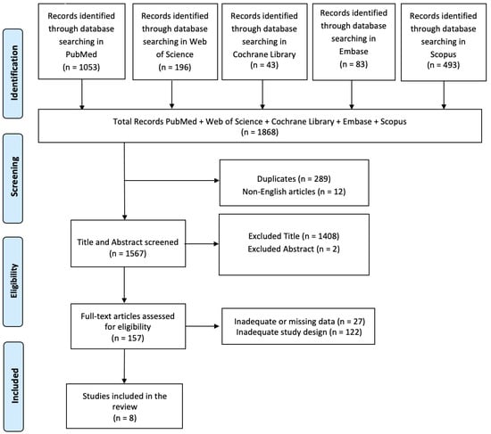 In total, 1868 articles were found: A total of 289 articles were removed due to duplication after screening; 12 articles were excluded because they were not published in English; and 1410 articles were excluded based on title and abstract screening. Finally, 149 articles were removed based on screening for inadequate study designs and untraceable articles (Figure 1). The review includes eight research articles considered eligible. A summary of these studies is shown in Table 2.