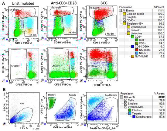 Functional assays of NK and T cells. Peripheral blood mononuclear cells were cultured in vitro with no-stimulation (unstimulated) or stimulated with anti-CD3/CD28 or BCG during 144 h to evaluate the following: (A) cell proliferation (CFSE-low cells) in CD3 + CD4 + (dark green) and CD3 + CD8 + (pale green) T lymphocytes as well as in CD56dim (blue) and CD56high (red) NK cells and noT-noNK cell subsets (orange); and (B) cytotoxicity against K562, T24 and J82 cell lines at different effector (green) to target (pale blue: alive and dark blue: dead) ratios. In both cases, a hierarchical and logical gating strategy was used in order to identify the corresponding cell subsets.