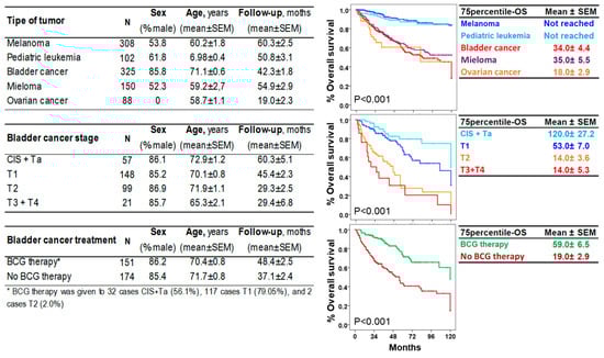 This study included 325 patients with BC, 150 patients with myeloma, 88 patients with ovarian cancer, 308 patients with melanoma, and 105 patients with pediatric acute leukemia with 75p-OS values of 34.04 ± 4.4, 35.0 ± 5.5, and 18.0 ± 2.9 years, respectively, and not reached for melanoma and pediatric acute leukemia (Figure 2). For BC, 57 were NIUN (CIS or Ta), and the rest UIC, with 148 T1, 99 T2, and 88 T3 or T4, and 75p-OS values of 120 ± 27.2, 53.0 ± 7.0, 14.0 ± 3.6, and 14.0 ± 2.9 years, respectively. BCG therapy was administered to 32 CIS + Ta cases (56.1%), 117 T1 cases (78.5%), and 2 T2 cases (2.0%). The 75p-OS values for BCG and other therapies were 59.0 ± 6.5 and 19.0 ± 2.9 years, respectively. The age and sex of the study groups are shown in Figure 2. The mean age of the HC group (n = 925) was 52 ± 0.7 years, with a proportion of 44.5% males.