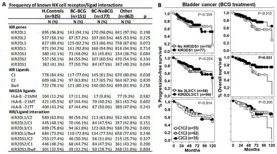 HLA C1 ligands showed a lower frequency in BC patients treated with BCG (70.0%, p = 0.038) than in BC patients undergoing other treatments (81.5%), in other cancers (80.0%), or in healthy controls (84.4%); therefore, C1 ligands were associated with lower susceptibility to low stages of BC, although this molecule did not significantly impact disease progression or patient outcomes.