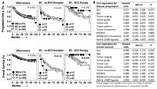 The HLA-B −21M/T genotype is an independent predictive parameter of the progression-free and overall survival of BC patients treated with BCG. (A) Kaplan–Meier and log-rank test for progression-free survival (PFS) and overall survival (OS) of patients with tumors other than bladder cancer (BC) and for patients with BC treated with BCG or other therapies according to the HLA-B −21M/T ligand genotype. (B) Cox regression analysis for PFS and OS of BC patients treated with BCG for age, tumor staging, grade, size, pattern, and recurrence, and in terms of HLA-B −21M/T ligand genotype.