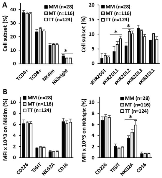 Although no differences in the expression of CD226, CD16, or TIGIT were associated with the HLA-B −21M/T genotype in CD56dim and CD56bright NK cells, the expression of NKG2A decreased proportionally to the number of −21M ligands (3.5 ± 0.50, 4.6 ± 0.45, and 5.9 ± 0.8 MFI × 103, p < 0.05, for MM, MT, and TT genotypes, respectively) in CD56bright cells but not in CD56dim NK cells.