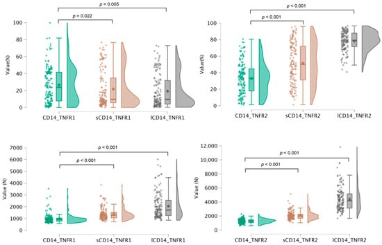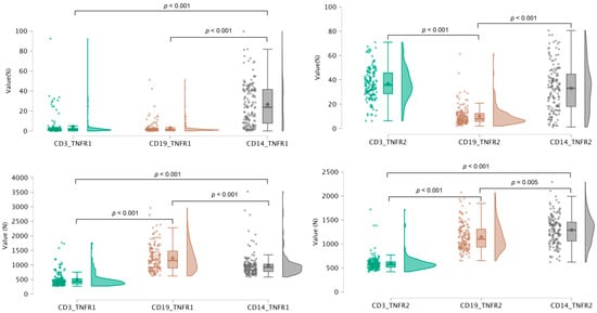 In the CD3+ T lymphocyte population, the proportion of TNFR-positive cells increases with age, whereas in CD14+ monocytes, the proportion of TNFR1+ and TNFR2+ cells decreases. These findings suggest an opposite directional shift in TNFR expression between different immune cell subsets. The age-related increase in TNFR expression among CD3+ T cells may reflect the expansion of senescent and effector T-cell subsets, which are more sensitive to pro-inflammatory stimuli, particularly TNF-α [,]. The elevated chronic inflammatory state (“inflamm-aging”) may further drive the expansion of TNFR-expressing T cells, reinforcing their role in the regulation of inflammation in aging individuals [,].