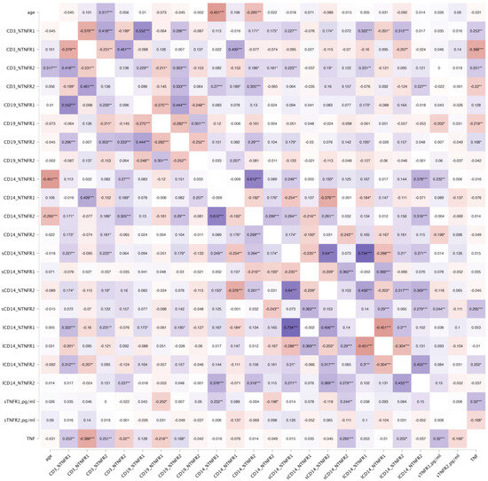 Heatmap of Spearman’s correlation coefficients between age and TNF system parameters, including membrane-bound receptor expression, soluble receptor levels, and serum TNF cytokine concentrations. Statistically significant correlations are indicated with asterisks: * indicates p < 0.05, ** indicates p < 0.01, *** indicates p < 0.001.
