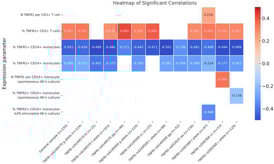 Heatmap of Spearman’s correlation coefficients between age and various TNF system parameters, including membrane-bound receptor expression, soluble receptor levels, and serum TNF cytokine concentrations, in subgroups stratified by genetic polymorphisms. Numerical values represent correlation coefficients, with statistically significant correlations (p < 0.05).