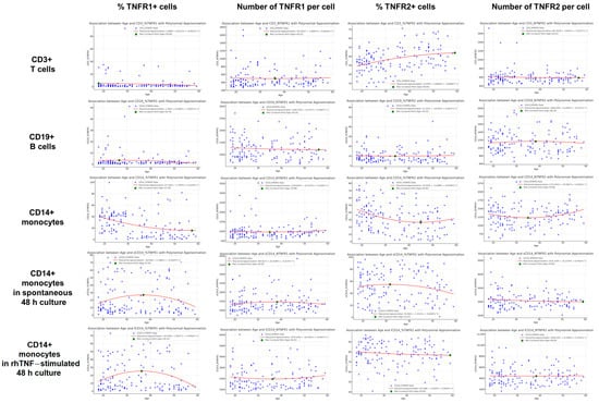 Data collection and analysis were performed using MS Excel 2016 and JASP v.0.16.3 (University of Amsterdam, Amsterdam, Netherlands, 2022). Quantitative data visualization was conducted using raincloud plots. For the analysis of quantitative variables in related groups, the Wilcoxon test or Friedman test was applied, with exact p-values reported. Post hoc analyses for the Friedman test were adjusted using Bonferroni and Holm corrections. Results were considered statistically significant at p ≤ 0.05. Data visualization, including polynomial regression curve fitting, identification of the point of maximum curvature using Tukey’s method of bends, scatter plots, and heatmaps, was performed using Python (version 3.11) with the following libraries: Matplotlib (version 3.7.1) for plotting, Seaborn (version 0.12.2) for heatmaps, Pandas (version 1.5.3) for data handling, and NumPy (version 1.23.5) for numerical computations. To assess the relationship between immune cell parameters and age, second-order polynomial regression models were applied to each investigated parameter. Polynomial approximations were used to capture the nonlinear relationship between age and TNFR1/TNFR2 expression on CD3+ T cells, CD19+ B cells, and CD14+ monocytes. Age-dependent trends were visualized using regression plots, and inflection points (regions of maximal curvature in the fitted polynomial functions) were identified to characterize critical transition ages in TNF receptor expression dynamics.