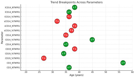 Trend direction of the association between cell percentages and TNFR1/TNFR2 expression levels with donor age, with inflection points calculated using Tukey’s method. Each circle represents a parameter-specific age breakpoint at which the direction of the trend changes. Red circles indicate a switch from an increasing to a decreasing trend (↑↓), whereas green circles indicate a switch from a decreasing to an increasing trend (↓↑). The horizontal axis shows donor age (in years), and the vertical axis lists the analyzed parameters.