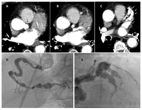 Coronary aneurysms in an 80-year-old female patient with stroke and rheumatoid arthritis. Panel a: right coronary; Panel b: left coronary (arrows mark the aneurysms). The patient had been admitted for sudden loss of consciousness. Chest computed tomography (panels A–C, Video S1) was performed for the suspect of lung embolism. The exam showed severe coronary aneurysms. At angiography (panel D,E), the aneurysms were so large that they could not be imaged in one single run despite large contrast volume.
