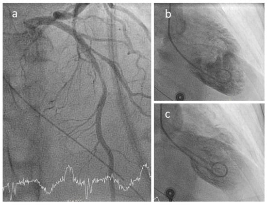 Coronary spasm in a 51-year-old female patient with ANCA-associated vasculitis and spasm of the proximal left anterior descending (panel a) causing a Tako-Tsubo-like contractile dysfunction (b,c).