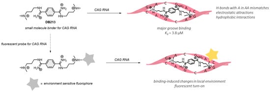 Chemical structure of DB213 that binds selectively to CAG RNA, and the design of a fluorescent probe for CAG RNA.