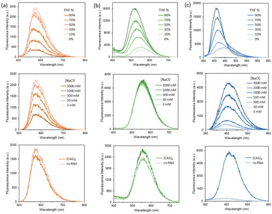 Fluorescence spectra of 10 µM (a) DB-Res (λex = 475 nm), (b) DB-Dan (λex = 330 nm), and (c) DB-TPE (λex = 300 nm) in different water/THF ratios (upper panel), ionic strengths with various NaCl concentrations (middle panel), and the presence of 1 eq. of a (CAG)6 RNA (lower panel).