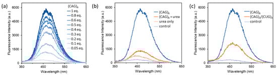 Fluorescence spectra of 10 µM DB-TPE (λex = 300 nm) in the presence of (a) increasing amount of (CAG)6 RNA from 0.05 to 1 eq., (b) 1 eq. of (CAG)6 RNA denatured by 1 M urea, and (c) 1 eq. of complementary (CAG)3/(CUG)3 RNA duplex.