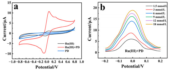 Three sensors were prepared using PD, Ru(III), and PD/Ru(III) as redox mediators, respectively, and were applied to detect glucose, utilizing cyclic voltammetry (CV) and differential pulse voltammetry (DPV). As shown in Figure 2a, cyclic voltammetry scans were performed on the three sensors for testing the 6 mmol/L glucose solution. It was observed that the CV curves of the sensors using only PD as the redox mediator do not have obvious redox peaks, which may be due to the low amount of PD utilized. This suggests that the mediator PD cannot transfer the electrons from the enzyme-catalyzed process to the electrodes directly. When Ru(III) and PD/Ru(III) were used as redox mediators, respectively, the CV curves of the corresponding sensors showed obvious redox peaks. The response current signal of the PD/Ru(III) sensor was much larger than that of the Ru(III) sensor, indicating that in the enzyme catalyzed glucose process, the mediator Ru(III) could only accept very few electrons in the enzyme catalytic process and transfer them to the electrode to trigger a small current response. In contrast, in the presence of both mediator PD and Ru(III), the PD can act as a bridge to redox reactions with the enzyme-active center within protein. After the double-bond of the conjugated quinone in its structure is opened, all the electrons are accepted and stored during the enzyme-catalyzed process [16], and then the bipyridine structure further transfers the stored electrons to Ru(III) through a complexation reaction [17]. Finally, the electrons are transferred to the electrode through the redox reaction of Ru(III) to trigger the response current. Therefore, the redox reaction process of glucose catalyzed by the PD/Ru(III) sensor can be deduced as the following Equations (1)–(4), in which the synergistic effect of PD and Ru(III) facilitates the electron transfer in the enzyme-catalyzed process and improves the response current signal of the sensor: