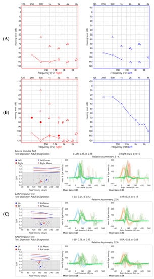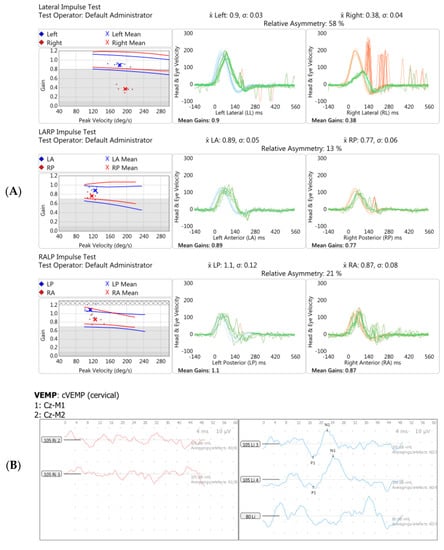 - Ciodaro, F.; Freni, F.; Alberti, G.; Forelli, M.; Gazia, F.; Bruno, R.; Sherdell, E.P.; Galletti, B.; Galletti, F. Application of Cervical Vestibular-Evoked Myogenic Potentials in Adults with Moderate to Profound Sensorineural Hearing Loss: A Preliminary Study. Int. Arch. Otorhinolaryngol. 2020, 24, e5–e10. [Google Scholar] [CrossRef] [Green Version]