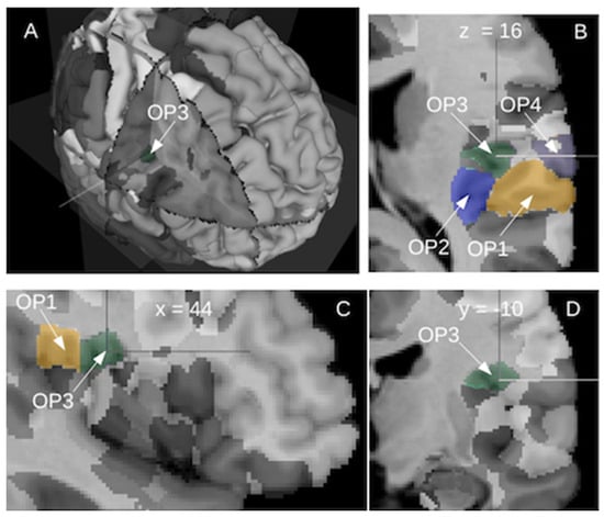 - Sepulcre, J. An OP4 functional stream in the language-related neuroarchitecture. Cereb. Cortex 2015, 25, 658–666. [Google Scholar] [CrossRef] [Green Version]