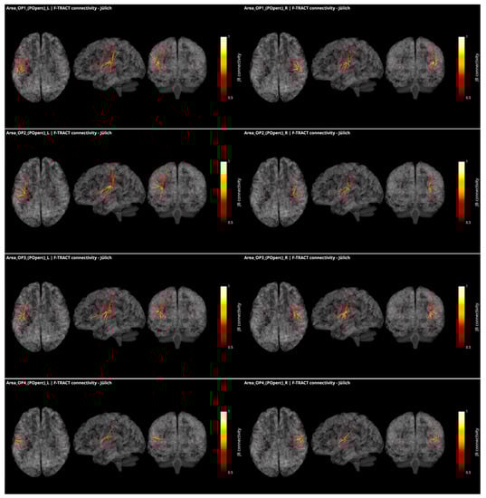 Intracortical connectivity of the four subregions of the parietal operculum from Jülich (‘JB connectivity’ stands for Jülich Brain connectivity). From top to bottom: area OP1, area OP2, area OP3 and area OP4. Left column for the subregions of the left hemisphere and right column for the subregions of the right hemisphere. Image derived from the data of the F-TRACT project (https://f-tract.eu), version of 1 December 2021.