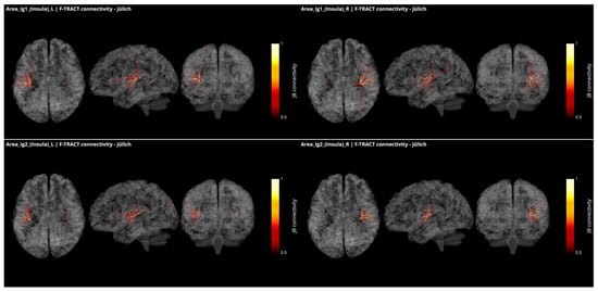 In Figure 4, all connections from the granular subregions Ig1 and Ig2 of the insula, which present borders with both the parietal operculum and the temporal cortex, are displayed with the same methodology and threshold as for Figure 3. These regions show strong connections with one another and with Ig3, as well as with dysgranular parts of the insula. They also present connections with the subregions of the OpP and with the subregions of the Heschl gyrus and the superior temporal gyrus. Additional connection was found with the motor area 4p and frontal area 44 from right Ig1. All but left Ig2 were connecting to the inferior parietal lobule.