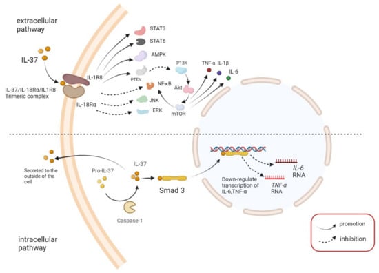 Interleukin-37 (IL-37), a novel cytokine which was once considered as a member of IL-1 family, was reported to be a natural innate immune inhibitor []. Similar to other IL-1 family cytokines, IL-37 is encoded by chromosome 2 []. All members of this family share a common b-trefoil structure that includes 12 β-chains []. IL-37 is encoded by six exons. At present, five subtypes (IL-37a–e) formed by alternative splicing have been found, among which IL-37b has the largest molecular weight and is the most researched []. IL-37b contains five exons except exon 3, and IL-37c and IL-37e are predicted to be non-functional proteins because they lack one or more exons []. Based on the fact that most of the current research is on the IL-37b subtype, the IL-37 mentioned below in this article refers to IL-37b. In addition, IL-37a is the only form found in the brain. An unstable mRNA motif exists in exon 5. IL-37a is generally considered to be the functional subtype, but little research has been concentrated on this subtype alone []. Although IL-37 is widely expressed in many cell tissues in the human body, the concentration in the blood is extremely low (100 pg/mL) []. In some diseases involving inflammation, IL-37 is elevated due to inflammatory stimulation [].