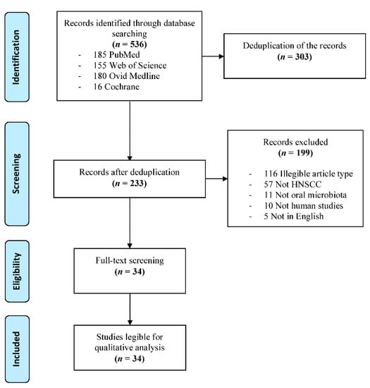 The literature search was conducted on the 13th of June 2021 without restrictions through four electronic databases: PubMed, Web of Science, Ovid Medline, and Cochrane. The applied search terms included: ((“oral microbiota”) OR (“oral microbiome”) OR (“oral bacteria *”) OR (“oral microbial”) OR (“oral microorganism”) OR (“oral microbe”)) AND ((“head and neck squamous cell carcinoma”) OR (“head and neck neoplasms”) OR (“head and neck cancer”) OR (“head and neck squamous cell cancer”) OR (“oral cancer”) OR (“mouth neoplasms”) OR (“laryngeal neoplasms”) OR (“gingival neoplasms”) OR (“lip neoplasms”) OR (“palatal neoplasms”) OR (“tongue neoplasms”) OR (“pharyngeal neoplasms”)). Following deduplication, studies were first assessed for eligibility, and then further screened for qualitative assessment. Two reviewers (MM and SH) independently screened and assessed the literatures. Differences in the results, if any, were resolved through discussion with a third reviewer (AS).
