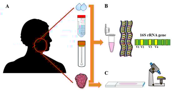 The different methods used for collecting and characterizing oral microbiota from patients with head and neck squamous cell carcinoma. (A) Oral microbiota samples are obtained by means of saliva expectoration; mouth wash samples; oral swab samples; or tissue biopsy. (B) Oral microbiota were characterized by DNA-DNA hybridization; primers targeting the 16S ribosomal RNA gene. (C) Immunohistochemistry of tumor sections was also used to identify oral microbiota.