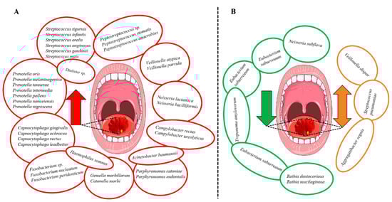 The relative abundance of the studied oral microbiota in oral squamous cell carcinoma (OSCC). (A) The bacterial species shown to have a higher abundance in OSCC (red circles; red arrow). (B) The bacterial species shown to have a lower abundance in OSCC (green circles; green arrow). In addition, a few species were shown to be increased in some studies and decreased in others (orange circles; orange double-headed arrow).