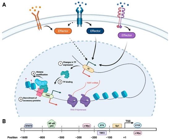 In addition to the core TERT:TR dimer, telomerase is composed of (i) the dyskerin-NOP10-NHP2-GAR1 tetramer (also known as the H/ACA RNP complex) that functions in telomerase RNP biogenesis []; (ii) TCAB1, which recruits the telomerase core to subnuclear Cajal bodies (CBs) for further processing by the H/ACA complex []; and (iii) the histone proteins H2A and H2B, which stabilize a critical TERT-interacting domain in TR during holoenzyme assembly []. TERT and TR are necessary to carry out telomere extension by telomerase []; thus, the expression of these components, particularly TERT, is under tight transcriptional control downstream of a host of intracellular signaling pathways that mediate changes in chromatin structure and transcription factor (TF) binding (Figure 1).