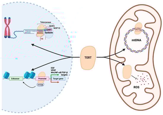 Extratelomeric functions of TERT. In the nucleus (left), TERT carries out its canonical role in telomere extension in complex with the other components of the telomerase holoenzyme (TR, dyskerin, GAR1, NOP10, NHP2). In addition, TERT binds to the promoters of genes that encode key growth factors (EGF, VEGF), as well as secondary effectors of tumor-promoting signaling pathways (Wnt, NF-κB, TGF-β), thereby positively or negatively regulating their expression. These transcriptional effects are frequently mediated by the actions of TFs or chromatin remodelers (CR) that complex with TERT at its target loci and influence both local and distant chromatin structure (i.e., at enhancers). In mitochondria (right), TERT possesses transcriptional, metabolic, and detoxification functions. In particular, TERT recognizes specific sites in the mitochondrial genome (mtDNA), which both alters mitochondrial gene expression and shields mtDNA from damage. Additionally, TERT plays a DNA-independent role in the neutralization of reactive oxygen species (ROS), which otherwise induces DNA damage and institute a host of aberrations in cellular metabolism and survival.