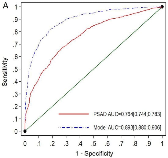 The efficacy of MRI-PMbdex in detecting csPCa was higher than that of mPSAD. The AUC was 0.893 (95% CI: 0.880–0.906) for MRI-PMbdex and 0.763 (95% CI: 0.774–0.783) for mPSAD, with p < 0.001 (Figure 1A). The MRI-PMbdex exhibited net benefit over mPSAD and over biopsy of all men from a csPCa probability threshold of 2%, while mPSAD exhibited net benefit over biopsy of all men from a csPCa probability threshold of 18% (Figure 1B).