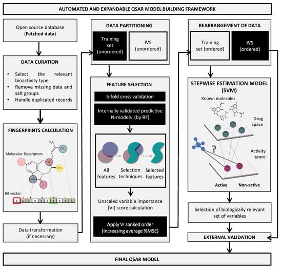 An automated and expandable framework for QSAR models’ building was used based on our previous work []. The open-source software KoNstanz Information MinEr (KNIME) was selected due to its graphical interface with several customized nodes []. R (version 3.4.4) [] was the open-source programming language chosen to perform the statistical evaluations. An overview of the used framework is shown in Figure 1. The complete process was divided into several systematic tasks of QSAR modeling, covered in the following sections.
