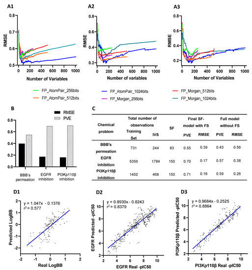 The performance of the presented QSAR modeling workflow was assessed by an unbiased protocol to support optimized predictive models for all chemical problems (Figure 2). The internal lowest RMSE in predicting BBB permeation (0.513), EGFR inhibition (0.193), and PI3Kp110β inhibition (0.175) was achieved by using AtomPair 1024-bit vectors, considering the 83 best-ranked features in BBB’s model and 150 features in the last two models (Figure 2A).