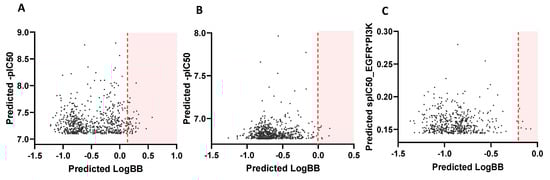 ZINC15 screening output. Each graphic was obtained by plotting the top thousand screened molecules for (A) EGFR inhibition, (B) PI3Kp110β inhibition, and (C) dual targeting. Orange lines mark the specified threshold for acceptable LogBB values and only hits from shaded area were selected.