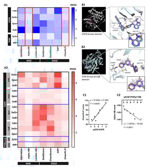 Selection and validation of unbiased molecular docking protocol: (A) Identification of most-fitted score function and crystallographic structure for each protein system by (A1) self-docking (plotted by red lined boxes) and (A2) cross-docking simulations (plotted by blue lined boxes), respectively. Heat maps are representative of RMSD values (in Angstrom) between the best-scoring docked pose and the co-crystallized ligand for each available crystallography, where each row represents a ligand and the columns the scoring functions for each tested software, MOE and GOLD. Grey boxes at left in (A2) represent the crystal structure used for each row ligand docking. (B) Protein–ligand interactions analysis. Ribbon representation of final (B1) EGFR (3w2s) and (B2) PI3Kp110β (4bfr) 3D structures with close-up view of the relevant binding residues using cartoon visualization of representative alignment of docked ligand (red) and crystallographic ligand (blue) from self-docking. (C) Validation of selected 3D models and docking protocols by correlation analysis between experimental values of standard molecules -pIC50 and (C1) GOLD CHEMPLP score for EGFR 3w2s 3D-model and (C2) MOE Alpha HB score for PI3Kp110β 4bfr 3D-model. Correlation coefficients r2 were obtained by linear regression statistical analysis.