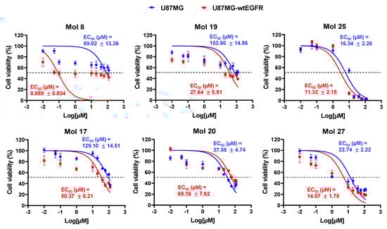 The cytotoxic potential of the selected 27 molecules (18 EGFR inhibitors, 6 PI3Kp110β inhibitors, and 3 dual inhibitors) in two well-recognized GB cell lines, namely U87MG (parental) and U87MG overexpressing EGFR (U87MG-wtEGFR), was explored by cell viability analysis. Most tested molecules promoted tumor cell death, from which two EGFR inhibitors (molecules 8 and 17), two PI3Kp110β inhibitors (molecules 19 and 20), and two dual inhibitors (molecules 25 and 27) caused more than 50% of the cell death. Their respective dose–response curves fetched EC50 values in the 16–130 µM and 0.09–70 µM range for U87MG and U87MG-wtEGFR, respectively, which largely outperform drugs currently under investigation.