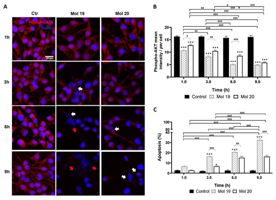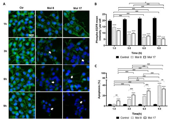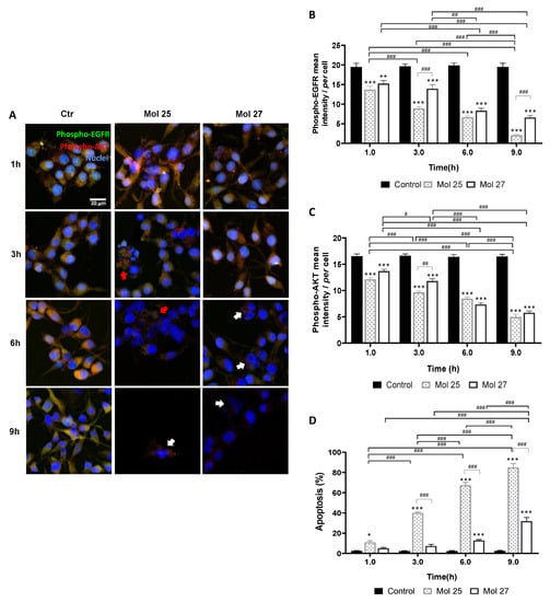To analyze target proteins expression, U87MG cells were seeded (1.2 × 105 cell/mL) in coverslips, grown for 48 h, incubated with each molecule at EC50 for 1–9 h, and then stained for phospho-EGFR (1:100, Cell Signaling, Danvers, MA, USA, #2236), phospho-AKT (1:100, Thermo Fisher Scientific, Waltham, MA, USA, #700256), or both. To analyze the cytotoxic effect of molecules in HBMEC, the cells were seeded (8 × 104 cell/mL) in rat-tail collagen-I-coated coverslips and after 48 h were treated with each molecule at EC50 for 9 h. HBMEC in coverslips were stained for: the junctional protein β-catenin (1:100, Thermo Fisher Scientific, Waltham, MA, USA, #71-2700), the cytoskeleton protein F-actin (1:1000, Phalloidin dye, Abcam, Cambridge, UK, #ab17675), and the efflux transporter P-gp (1:50, Santa Cruz Biotechnology, Dallas, TX, USA, #sc-390883). HBMEC seeded on polyester inserts for transport assays were also stained for the junctional protein zonula occludens-1 (ZO-1, 1:200, Thermo Fisher Scientific, Waltham, MA, USA, #40-2200) and the cytoskeleton protein vimentin (1:100, Thermo Fisher Scientific, Waltham, MA, USA, #MA3745).